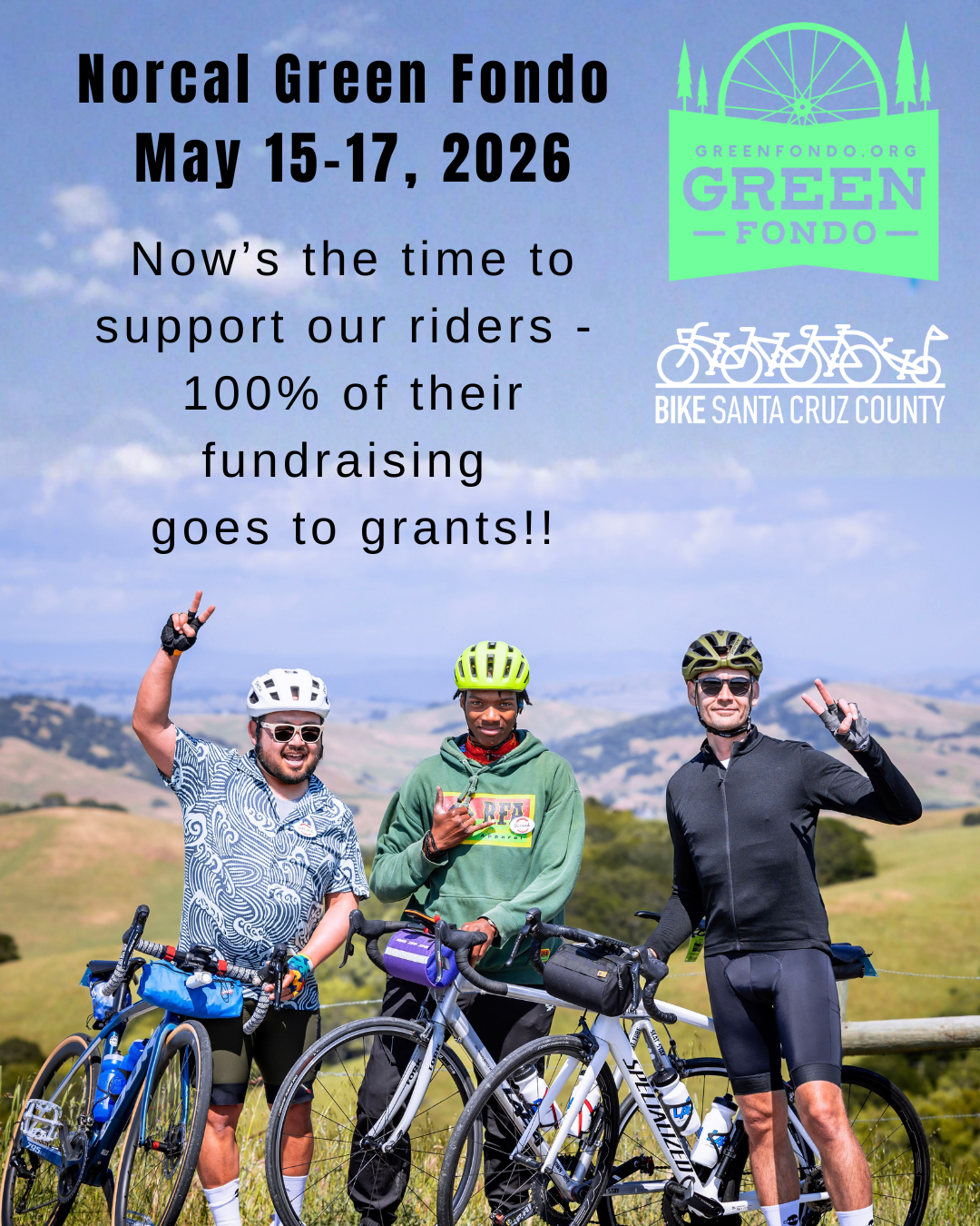 Registration for Green Fondo 2026 has closed, and we are happy to announce Team Bike Santa Cruz County is 21 riders strong! Climate Ride maintains a wait list if you missed your sign-up chance, but you can still support our riders with a monetary pledge. 100% of rider fundraising comes directly to Bike Santa Cruz County to support our work for better and safer cycling in Santa Cruz County!