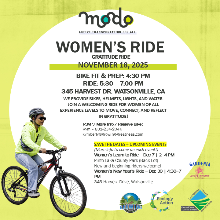 We provide bikes, helmets, lights and water. Join a welcoming ride for women or all experience levels to move, connect, and reflect in gratitude.